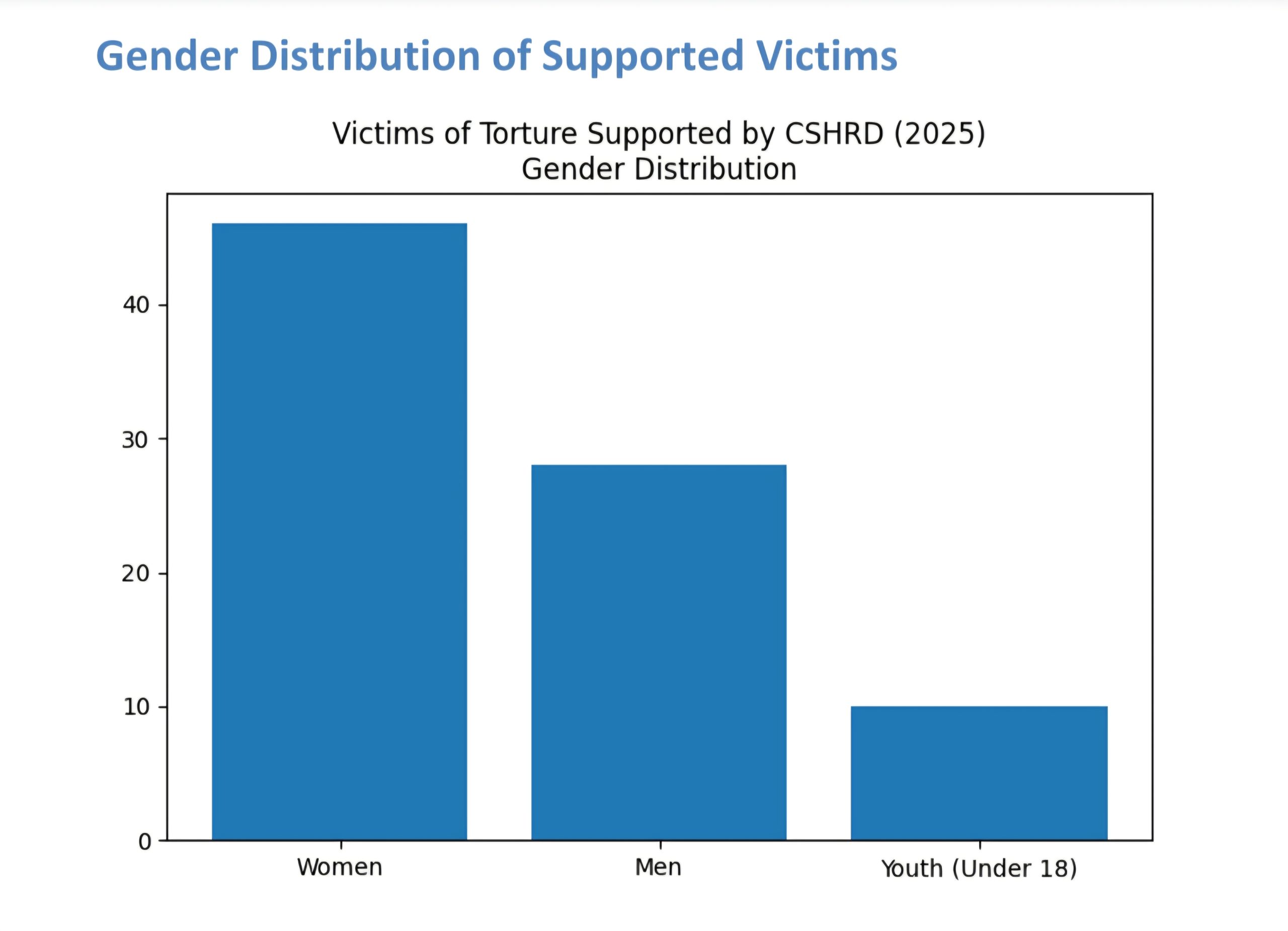 In 2025, the Coalition of Somali Human Rights Defenders (CSHRD) supported a total of 84 victims of torture through its rehabilitation and livelihoods support program. Victims included women, men, and youth affected by torture committed by both state and non-state actors.
